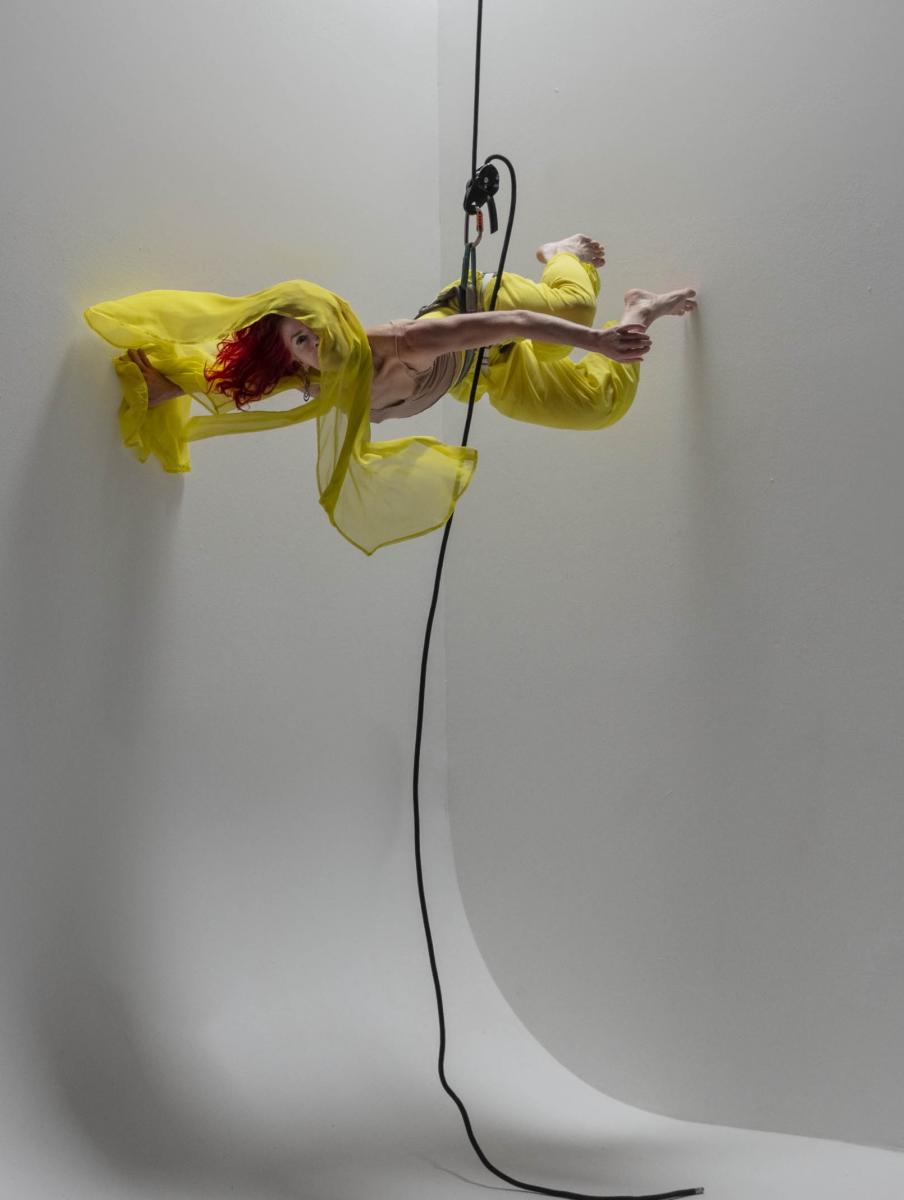 Sonsherée extending all limbs in four directions while gazing upward, owl shadow in the background. Photo Credit: RJ Muna